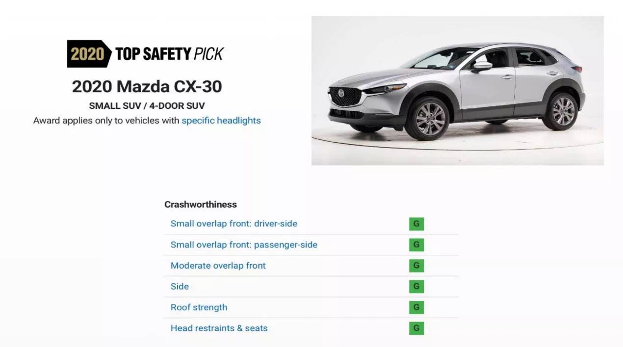 此外,基于“以人為本”的駕乘理念,MAZDA CX-30也在著(zhù)力為駕乘者提供安全、安心的駕駛環(huán)境,打造全方位的人性化安全保障。除了在IIHS2020年度碰撞測試中斬獲“TSP”評級之外,MAZDA CX-30還摘得澳大利亞A-NCAP五星安全評級,并以接近滿(mǎn)分的成績(jì)斬獲歐洲NCAP五星安全評級,為同級別車(chē)型打造出全新安全標桿。