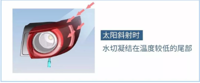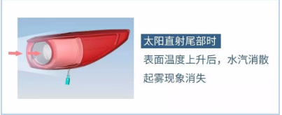 當太陽(yáng)照射側面時(shí),尾燈內部溫度上升,而尾部鏡面溫度較低,導致水汽凝結,表面起霧。